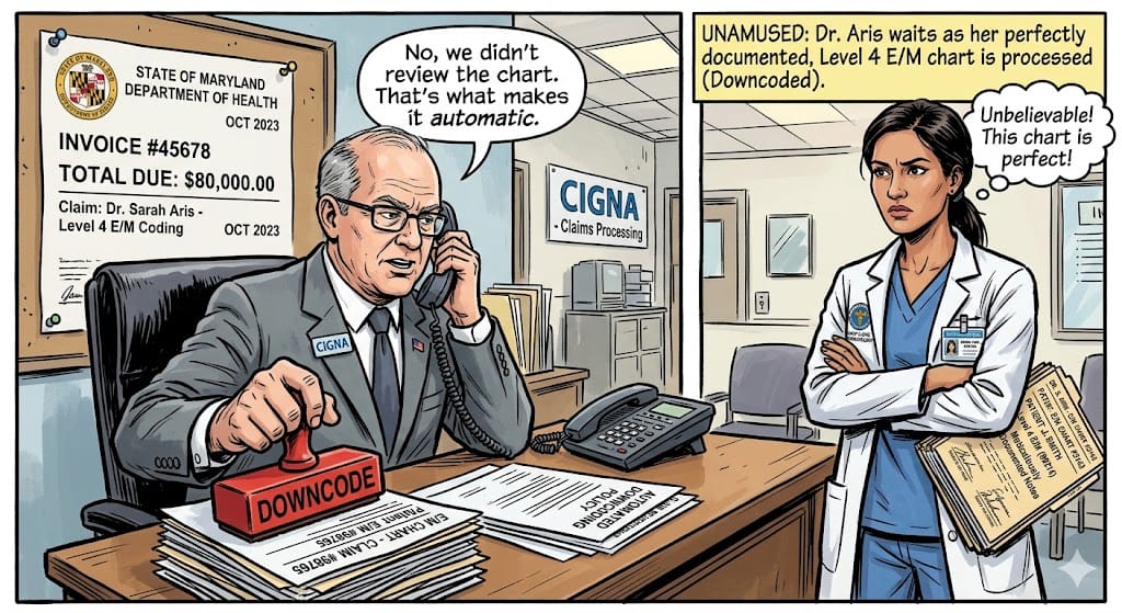 Maryland fined Cigna $80,000 and ordered a halt to automatic downcoding of E/M codes 99204-99205 and 99214-99215, ruling that the insurer must formally dispute claims and request documentation rather than adjusting them unilaterally; Cigna says the policy affects only 1% of in-network physicians, but the precedent matters for every state that hasn't drawn the same line yet (we covered the full payer playbook in The Downcoding Playbook for Dermatology).